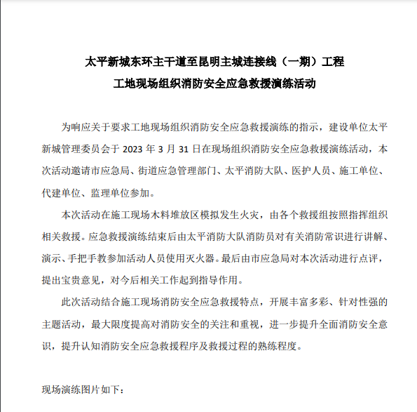 太平新城東環(huán)主干道至昆明主城連接線(一期)工程 工地現(xiàn)場組織消防安全應(yīng)急救援演練活動