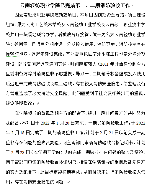 云南輕紡職業(yè)學(xué)院已完成第一、二期消防驗收工作