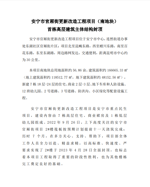 安寧市官廂街更新改造工程項(xiàng)目(南地塊)首棟高層建筑主體結(jié)構(gòu)封頂